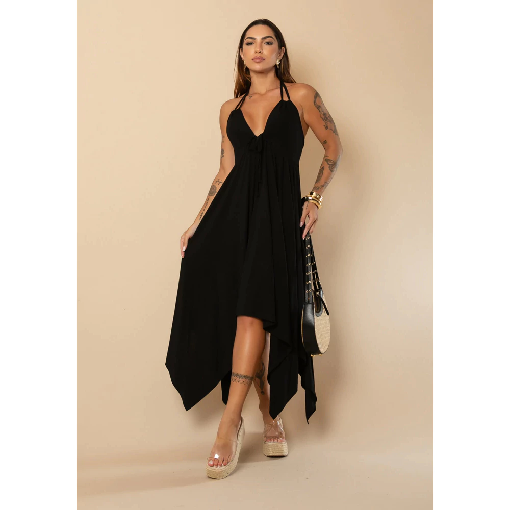 - Tecido Fluido e Leve: Confeccionado em tecido de toque suave, o vestido proporciona uma sensação de frescor, sendo ideal tanto para eventos diurnos quanto noturnos.